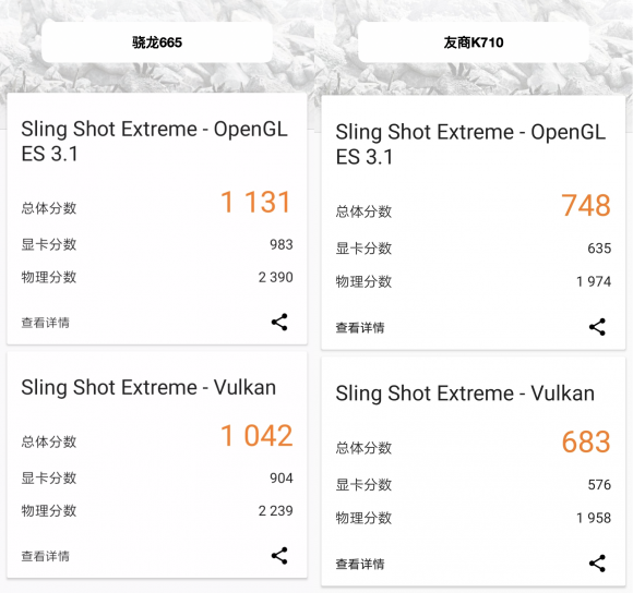 在专业图形测试软件3D Mark中,选择Sling Shot Extreme这样的高压力高负载场景下,骁龙665得分1131分,是K710的1.5倍以上。在Vulkan API下,骁龙665的成绩也比K710高52%。