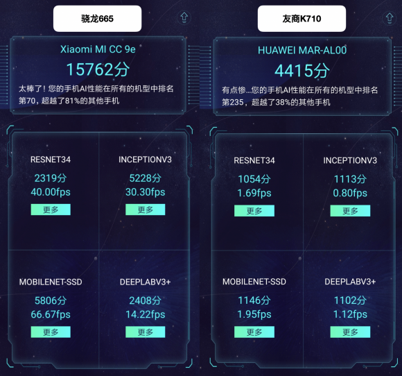 在AImark测试中,搭载骁龙665的小米CC9e得分15762分,友商K710仅4415分,两者差距明显。而且无论RESNET34、INCEPTIONV3还是DEEPLABV3+等所有子项,骁龙665都实现了对K710的全面碾压。