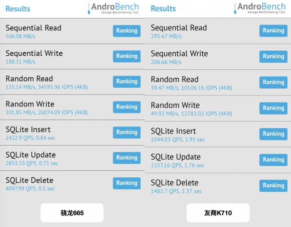 在GeekBench 4测试中,骁龙665和友商K710平台相比,单核以及多核得分都略胜一筹。