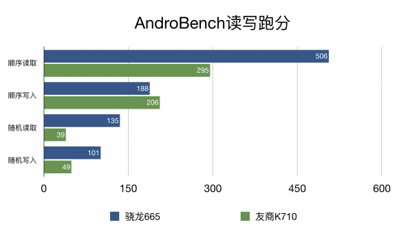 小米CC9e搭载了LPDDR4x内存和UFS 2.1闪存,其数据读写能力更加优秀。在Androbench测试中,单通道UFS 2.1的小米CC9e顺序读取506MB/s,随机读写也双双破百,比起K710手机内置的eMMC闪存优势明显的,在游戏解压、加载速度上会有更加优秀的体验。