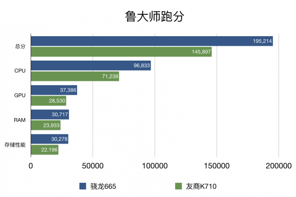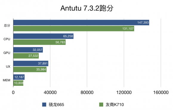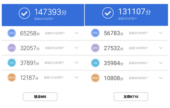 了解完CPU、GPU以及AI等单项能力后,我们不妨通过目前主流的跑分软件比较下骁龙665和K710的整体实力表现。骁龙665安兔兔得分147393,K710平台131107。