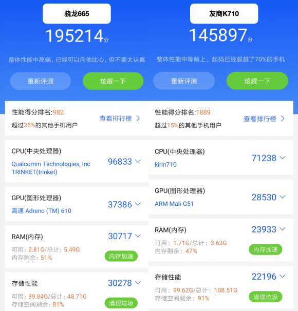 而在另一款跑分软件中,搭载高通665的小米CC9e得分195214,远高于K710平台的145897分,同样高于骁龙660的165683分。
