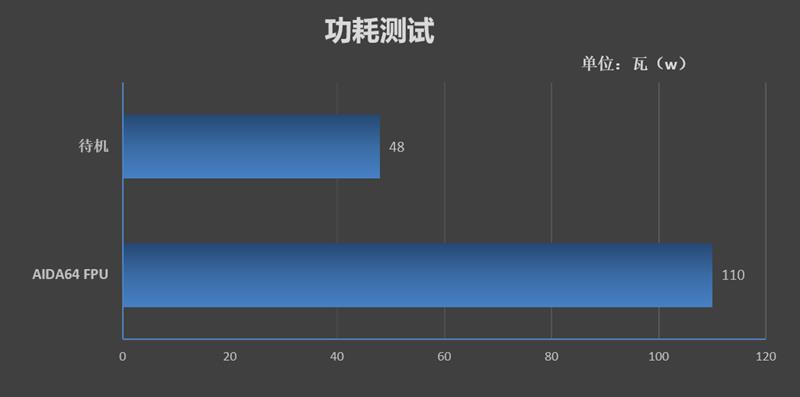 在待机时,i5-9400F整机功耗为48W,使用AIDA64 FPU进行烤机时,功耗也非常之低,仅有110W。