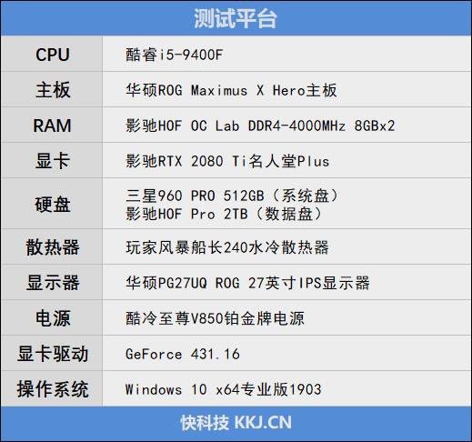 显卡方面从性价比和硬件匹配角度讲,最佳选择应当是RTX 2060、GTX 1660 Ti这样的主流和性能级产品,不过这里为了从理论上考验i5-9400F的游戏实力到底能达到什么程度,我们选择了一块最顶级的RTX 2080 Ti,并且加入4K分辨率测试,看看它能不能带的动。