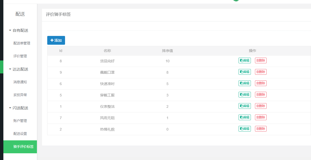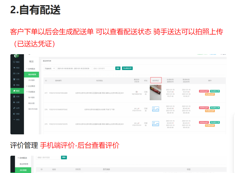用我们的系统来讲解的话,我们系统包括自有;达达;闪送这三个配送方法,自有配送就是系统独立的APP,能抢单能派单,基于这个自由配送的功能下还有就是一个评价管理可以评估旗下的配送员的态度如何,利于提高服务水平这样
