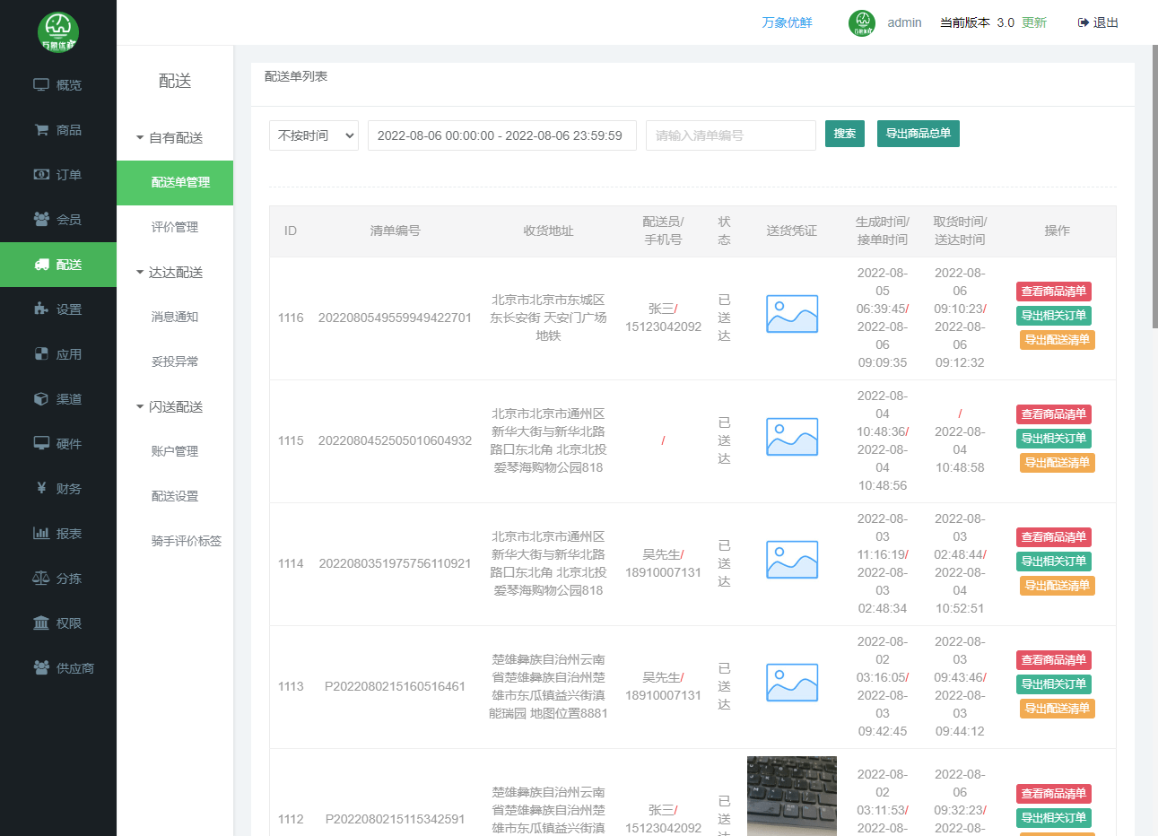 配送管理:系统可以分配配送人员去对接,可以借助第三方的工具去进行处理,大大地减低了生鲜配送企业的管理成本。而且运输的过程中可以看到配送的状态情况