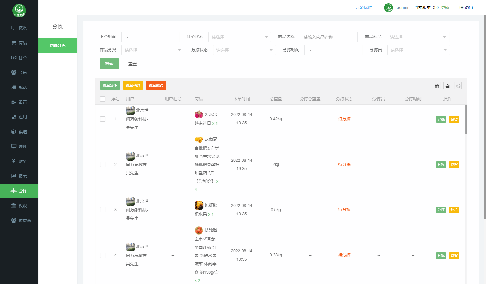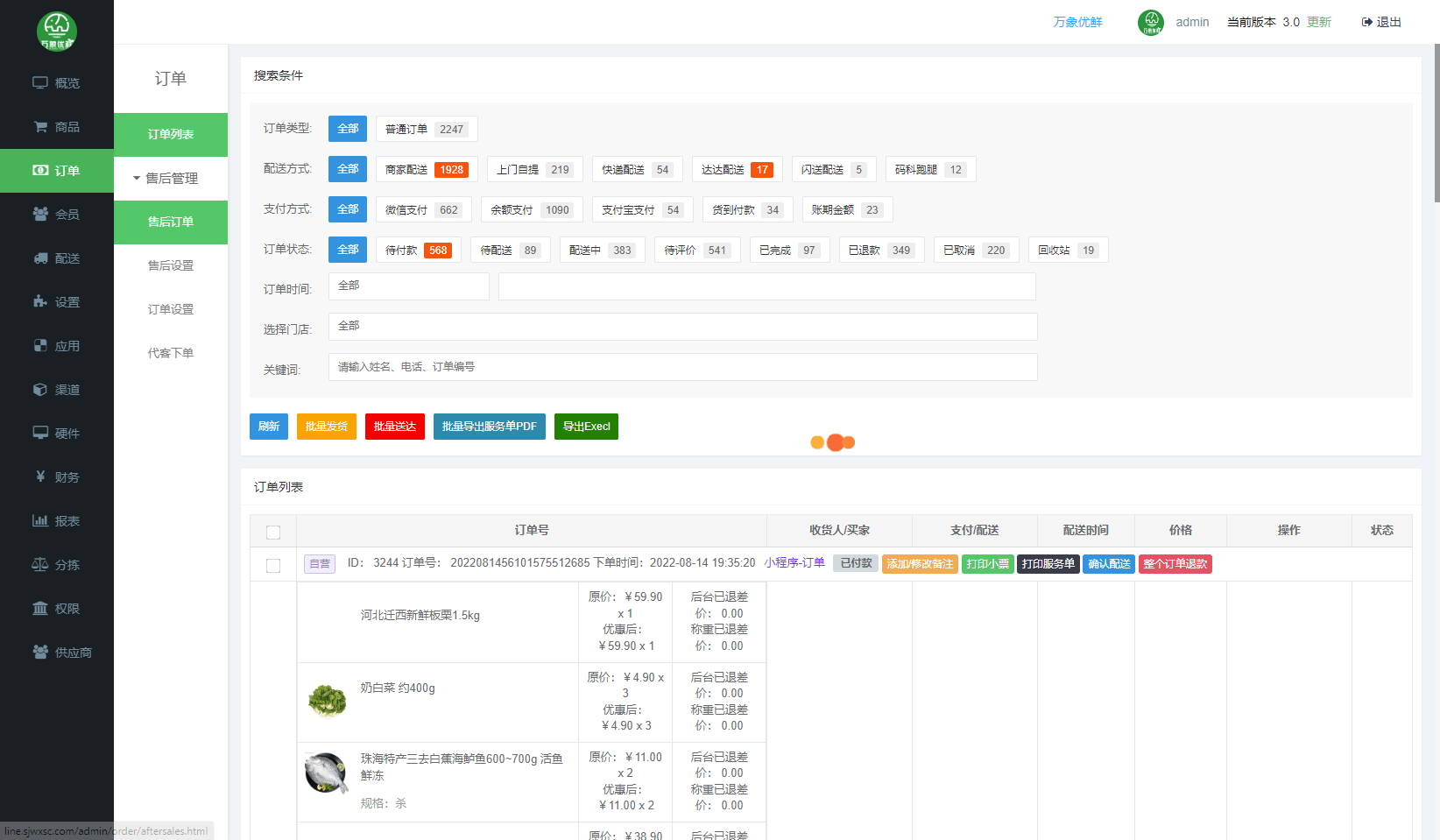 订单功能:分为总的订单,用于查询状态,然后还有售后订单,从安排发货还有退差价等关于订单上的操作大部分都是再这个功能里面进行操作,对生鲜配送系统来说是比较重要的功能之一